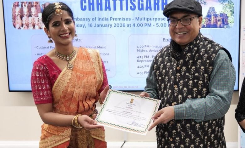 रायपुर। आयरलैंड की राजधानी डबलिन में भारत की सांस्कृतिक विविधता की एक सशक्त झलक देखने को मिली, जब स्टेट कल्चरल इवेंट सीरीज़ के तहत भारतीय दूतावास, डबलिन द्वारा छत्तीसगढ़ राज्य पर केंद्रित भव्य सांस्कृतिक आयोजन का सफल आयोजन किया गया। इस कार्यक्रम में आयरलैंड में रह रहे भारतीय समुदाय के सदस्यों ने भी उत्साहपूर्वक सहभागिता की।