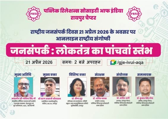 रायपुर: पब्लिक रिलेशन्स सोसाइटी ऑफ इंडिया (PRSI), रायपुर चैप्टर द्वारा राष्ट्रीय जनसंपर्क दिवस के अवसर पर “जनसंपर्क : लोकतंत्र का पांचवां स्तंभ” विषय पर एक दिवसीय ऑनलाइन राष्ट्रीय संगोष्ठी का आयोजन किया गया। संगोष्ठी में देशभर के जनसंपर्क विशेषज्ञों, वरिष्ठ पत्रकारों, संचार विशेषज्ञों और शिक्षाविदों ने भाग लेकर लोकतंत्र में जनसंपर्क की बदलती भूमिका पर सार्थक चर्चा की।