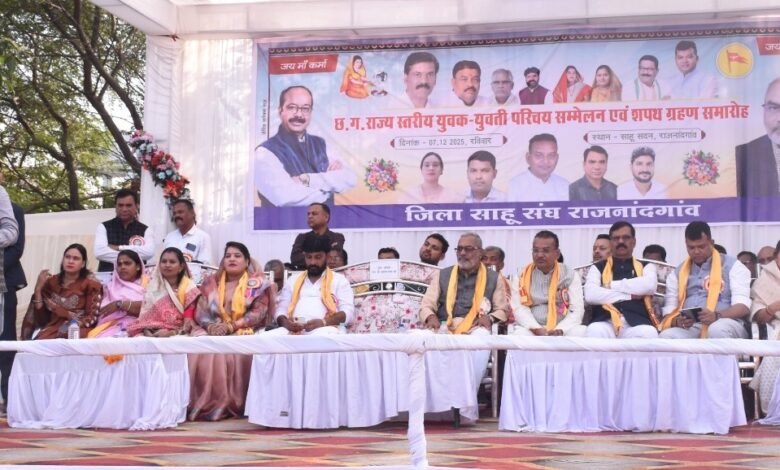 राजनांदगांव 07 दिसम्बर 2025/ उप मुख्यमंत्री अरूण साव साहू सदन राजनांदगांव में आयोजित साहू समाज के छत्तीसगढ़ राज्य स्तरीय युवक-युवती परिचय सम्मेलन एवं शपथ ग्रहण समारोह कार्यक्रम में शामिल हुए। इस अवसर पर उप मुख्यमंत्री श्री साव ने साहू सदन परिसर में मां कर्मा मंदिर जीर्णोद्धार और डोम शेड का लोकार्पण किया। श्री साव ने युवक-युवती परिचय सम्मेलन में शामिल होने वाले युवक-युवतियों को बधाई एवं शुभकामनाएं दी और उनके उज्ज्वल भविष्य की कामना की। कार्यक्रम में रायपुर ग्रामीण विधायक मोतीलाल साहू, कसडोल विधायक संदीप साहू, अध्यक्ष छत्तीसगढ़ तेलघानी बोर्ड जितेन्द्र साहू, उपाध्यक्ष जिला पंचायत किरण साहू, अध्यक्ष प्रदेश साहू संघ डॉ. नीरेन्द्र साहू, अध्यक्ष जिला साहू संघ भागवत साहू सहित जनप्रतिनिधि व साहू समाज के पदाधिकारीगण, बड़ी संख्या में साहू समाज के युवक-युवती व समाज के सदस्य उपस्थित थे।
